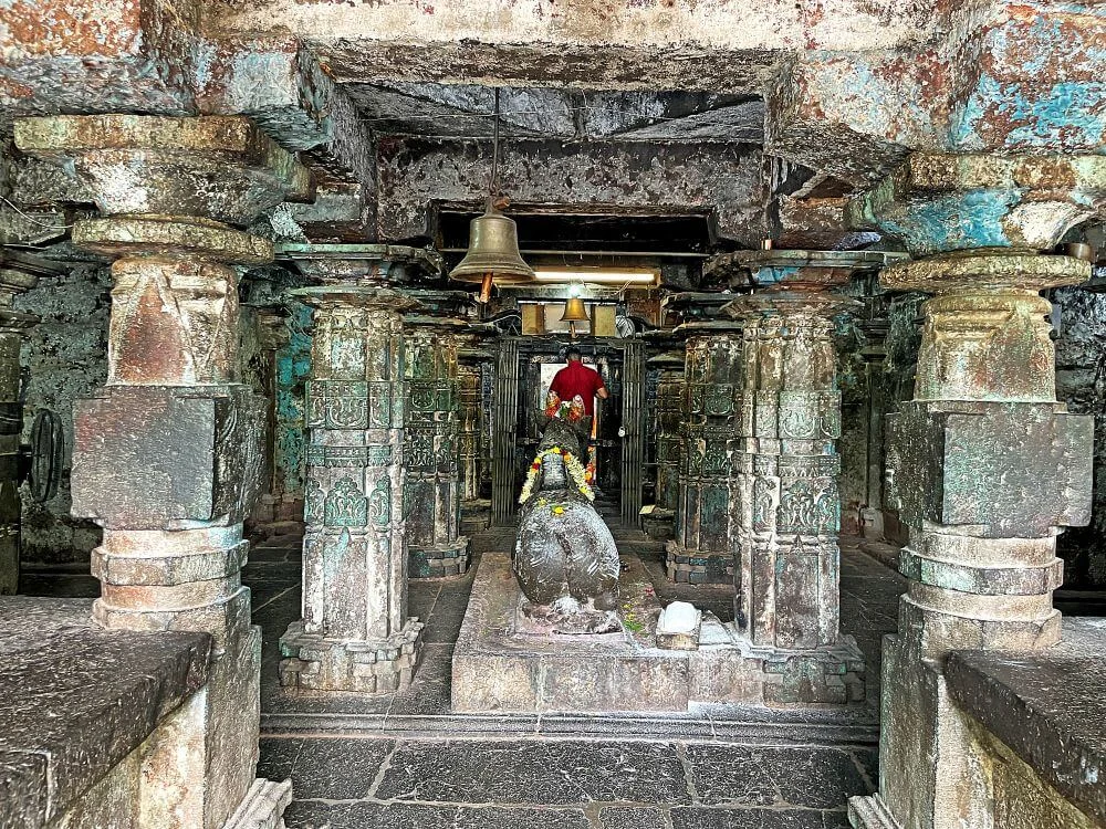 The main sanctum’s lingam is a rare artistic masterpiece—the dual statue of Shiva and Parvati richly ornamented, with Shiva holding a trident and rosary, and Parvati carrying a lotus and noose, framed by a carved Prabhavali halo. Above Shiva’s trident, Brahma is carved, flanked by the Ashtadevatas and the fierce Kirtimukh