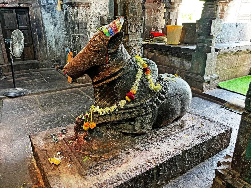 Ascending from the courtyard, visitors pass through the Nandi Mandap, decorated with a monolithic Nandi statue whose horns align symmetrically with the temple spire. Inside, vivid carvings of deities including Ganesh, Saptamatrikas, Mahishasuramardini, and Chamunda adorn the walls. Chambers dedicated to Shandilya Rishi and ceremonial resting places for the deity enhance the sanctity.