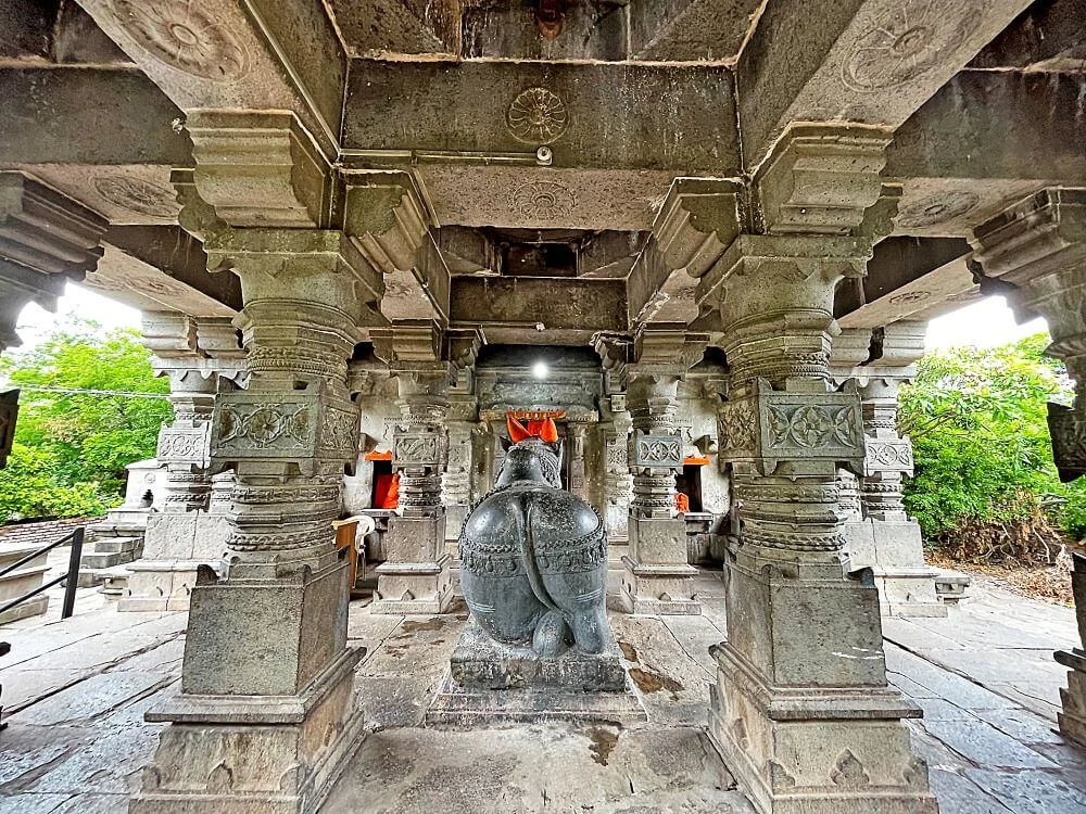 The approach greets devotees with twin carved stone lamp towers (Deepmalas), especially grand during Diwali and Maha Shivratri. The mandapa (assembly hall) is flanked by 30 pillars—circular and square—with carvings reflecting human emotions, daily life, wrestlers, dancers, and a menagerie of animals such as horses, elephants, mythical Sharabha, rhinos, monkeys, peacocks, and celestial beings. Fine floral and gemstone motifs decorate the pillars; Indo-Islamic influence is evident in some bases and door frames. A stone Nandi is placed at the entrance, facing the sanctum that houses the historic Shiva lingam and a Ganesh idol