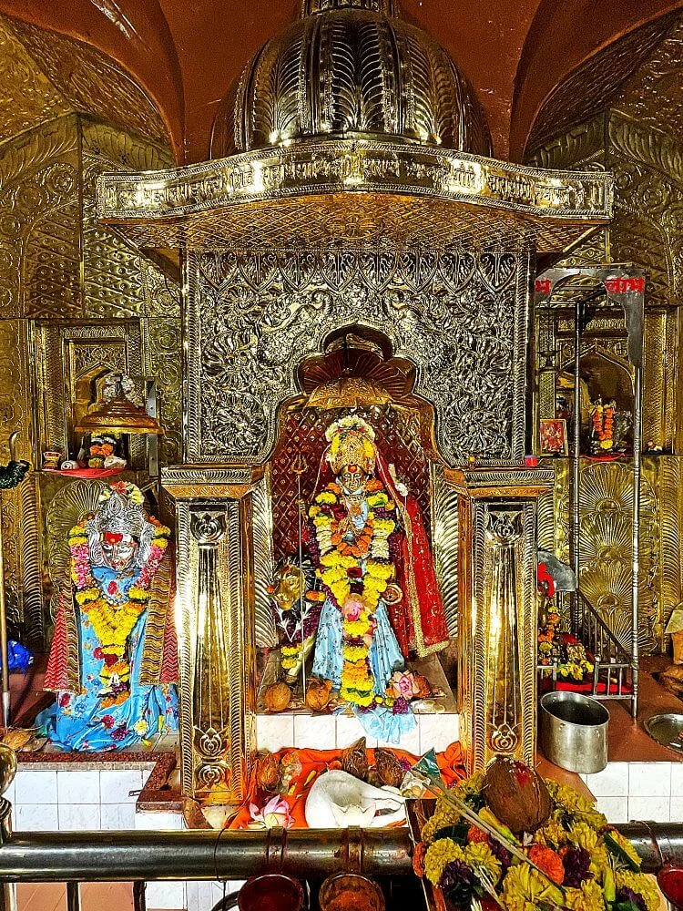 The temple complex is accessed via the Ganesh Darwaza entrance of the fort, a hilltop site overlooking Kalyan creek and the Ulhas river. After passing a small Ganesha shrine, devotees enter the paved courtyard, where the main Durga temple—guarded by carved elephants and royal symbols—stands on the left. The assembly hall leads into the sanctum, where the 3.5-foot Panchdhatu Durga idol stands, crowned and four-armed, with weapons and a lion. The inner walls gleam with gold-plated plates and intricate artwork, while a metal mask (tandala), Ganesha, and other deity idols are preserved nearby. Behind the sanctum is an inscription detailing the temple’s storied history.