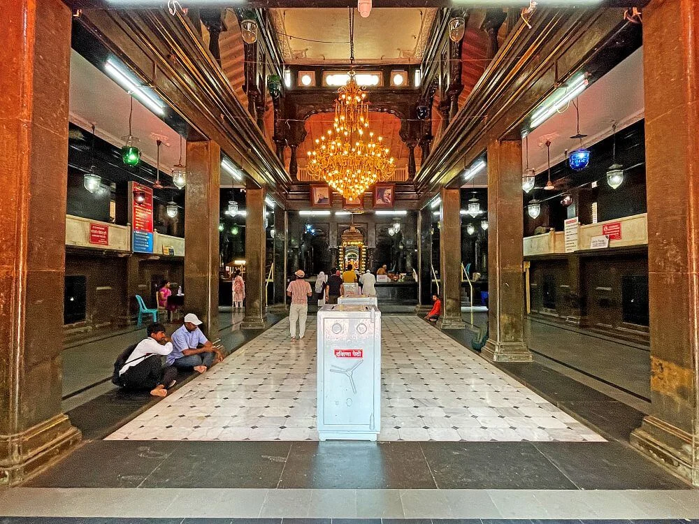 The Sabhamandap (assembly hall) is an architectural jewel, enclosed by ornate carved pillars, arches, and balconies where royal women once watched festive events. A majestic chandelier hangs from the ceiling, illuminating the sacred space. The sanctum (Garbhagriha) enshrines a magnificent four-armed marble idol of Ganesh, trunk curving to the left, holding pash, ankusha, modaka, and tusk. Flanked by Riddhi and Siddhi, the idol stands before an intricately carved gold Prabhavali. Surrounding the sanctum are the Panchayatan deities, sculpted from marble brought from Mahabaleshwar, placed with care following scriptural guidance from eminent scholars.