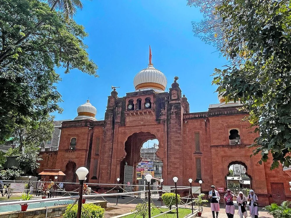 Approaching the temple, visitors first pass through a two-storey pink stone gateway sourced from Gokak. Featuring a central arch, flanking sub-entrances, mahirap arches, guard rooms, and a Nagarkhana (drum chamber), it leads into a landscaped courtyard with fountains that guide pilgrims to the elevated black-stone shrine.