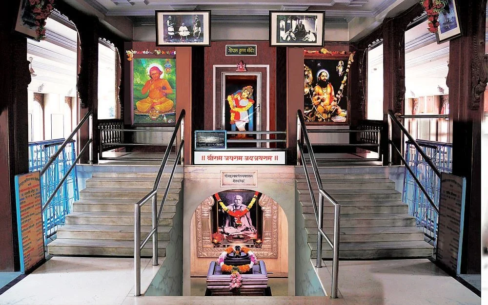 The temple complex grew around Maharaj’s samadhi (final resting place), where he attained eternal peace in 1913. Originally, Maharaj had transformed his own home into a Ram Mandir, then expanded the site to include temples of Datta and Shani, meditation halls, and vast facilities for visiting disciples and pilgrims. The mandir itself was constructed in 1936–37, featuring a spacious prayer hall and sanctum with a Gopal Krishna idol above, and Maharaj’s samadhi in the basement below. The sanctum is adorned with images of Ram, Sita, Lakshman, and Hanuman, and is continually filled with the soothing chant “Shriram Jayaram Jayjay Ram”—echoed by hundreds at daily aarti and kirtan