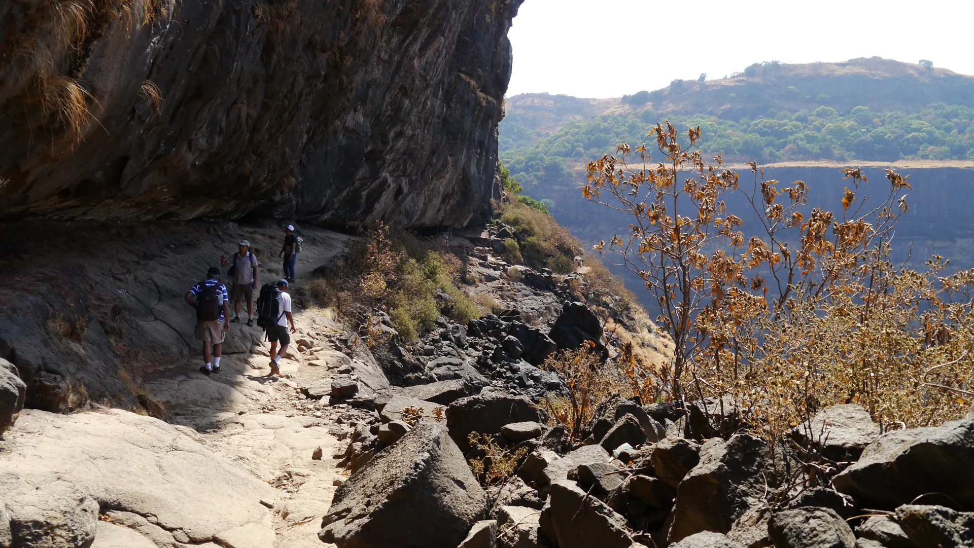 There are multiple routes to reach Harishchandragad. All include a long trek with moderate to difficult climbing. Easiest route is from Village Pachnai. A winding trail along the cliff takes climber directly to Harishchandreshwar Temple