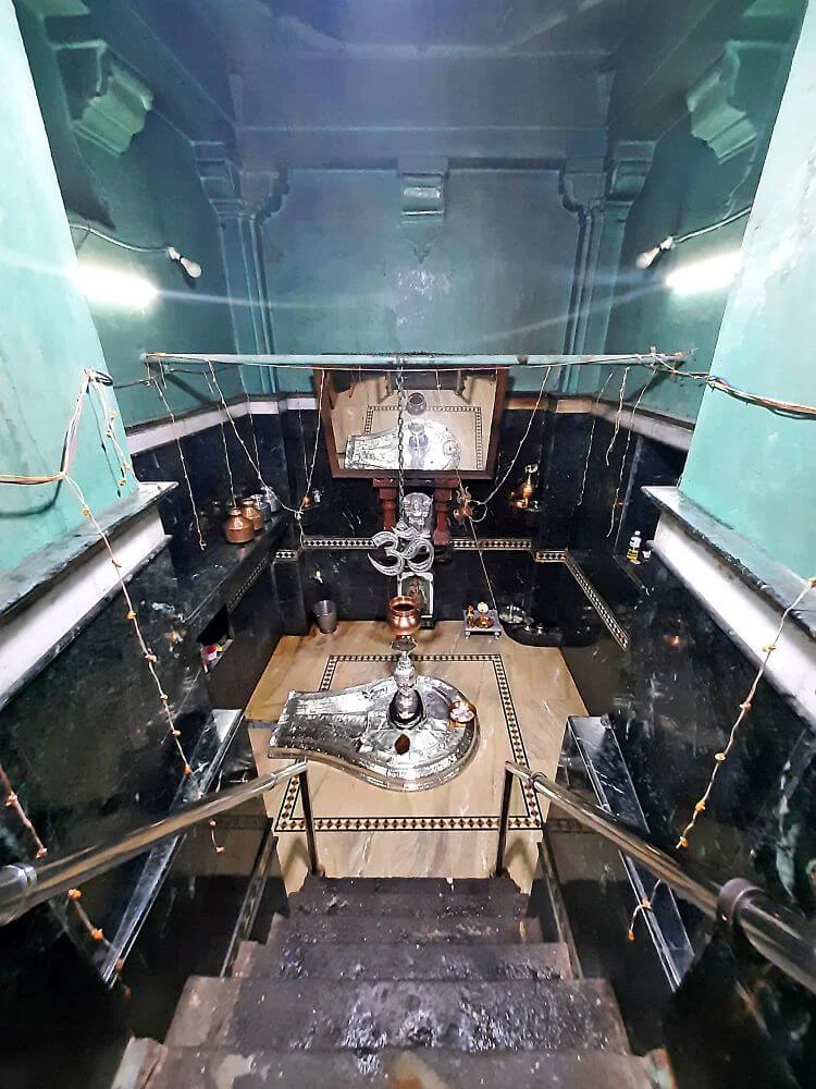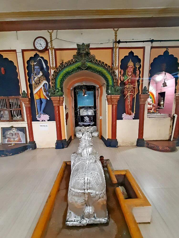 At the entrance, visitors are greeted by a large octagonal tank (kund) that retains water year‑round. The intricately sculpted gateway is supported by Sheshanaga, the cosmic serpent, while stone lions and guardian figures flank each side. Inside, the temple follows the traditional design of Sabhamandap – Antaral – Garbhagriha. A grand silver‑plated Nandi faces the sanctum, where the Shiva Linga — a Patalalinga (ground‑embedded form) — rests, sheathed in silver and sheltered by a serpent hood. Beneath it, five smaller linga forms known as the Panchalinga remain submerged in water throughout the year.
