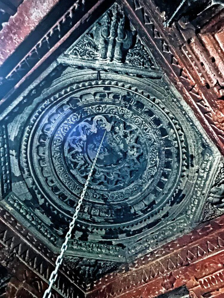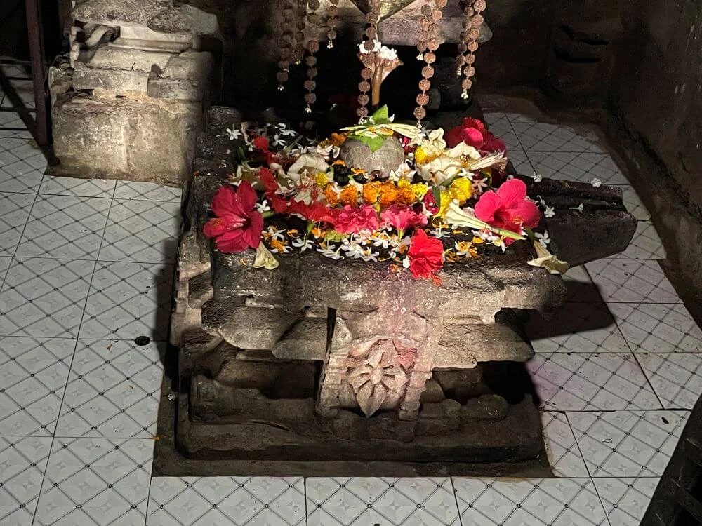 The temple complex includes a pillared sabhamandap adorned with stone carvings and a vestibule leading to the sanctum. The Nandi statue faces the sanctum, and a homa kund graces the entry for fire rituals. The sanctum’s five-part doorway flaunts beautifully carved guardians and a Ganesh sculpture above. The Shivling is square-shaped and rests on a Sri Yantra base, with the shalunka sculpted to resemble a Kadamba leaf—an extremely rare design. The rear wall houses images of Parvati and Ganesh, with a stone well and seating for devotees outside.