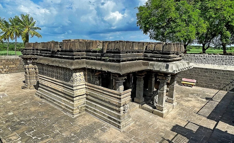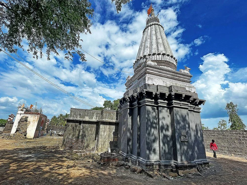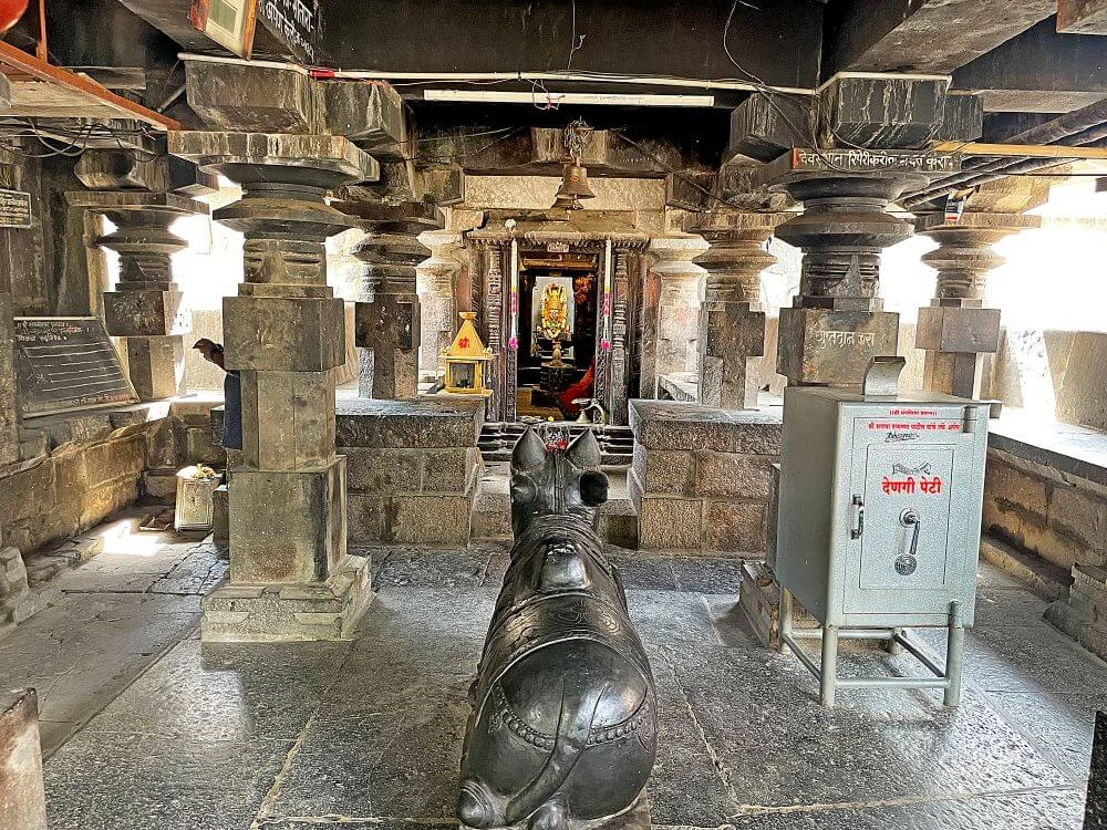 The Sangameshwar Temple, dating to Shaka 940 (1018 CE) under Chalukya King Jayasimha III, features a rare three-line Marathi inscription—considered the oldest in the language—engraved in its assembly hall. Its fortress-like stone compound surrounds a trikuta-style structure with three sancta. A Ganesha-relief-laden entrance leads to the paved courtyard and heavy stone platforms for rituals. Inside, carved pillars of geometric shapes support porches and a sabhamandap. A majestic pedestal holds Nandi, and the sanctum’s five-faced Shiva Lingam is worshipped alongside a brass-masked Mahadeva under a serpent hood. The two-tiered spire, decorated with miniature Nandis and deities, is crowned with an amalaka and kalash.