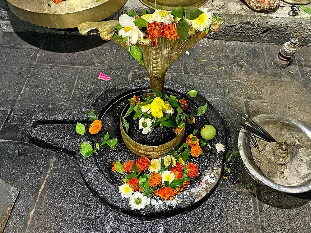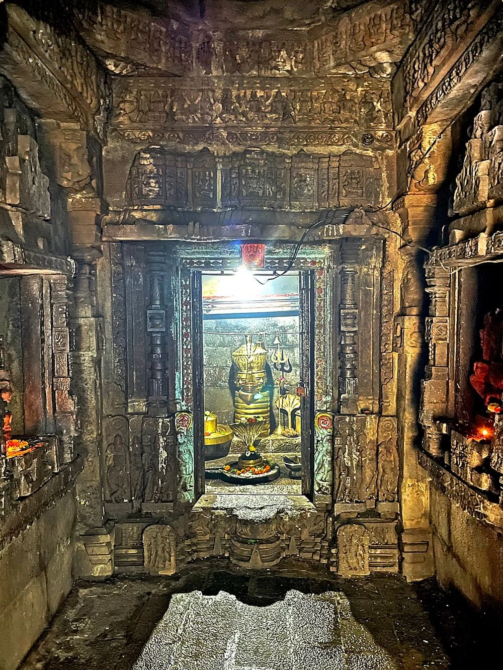 Artistic highlights include a Ganesh lintel at the entrance, Kirtimukha masks, and sculptures of Varaha, Nandi, Ganesh, Kubera, ascetics, Shivgana, Ganga, and Yamuna throughout the outer wall and doorframes. Inside, the sabhamandap (pillared hall) is a celebration of artistry, with Gandharva, Yaksha, Kinnara, Shiv–Parvati, and Kali idols, plus musician and dancer engravings. The sanctum houses a brass Shiva lingam crowned by a coiled serpent, supplied with ritual water from a kamandalu (pot), representing the Kukadi River’s ancient source
