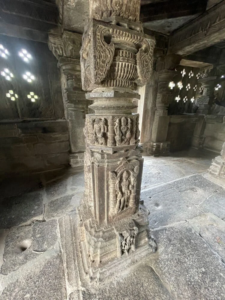 Three entrances—west, north, and south—give easy access to the sabhamandap (assembly hall), vestibule, and sanctum. Every pillar displays intricate decorative bands: the lower panels depict rows of elephants, tigers, and combat scenes from the Ramayana. Above these, lifelike carvings of Vali and Sugriva, celestial maidens, and deities in musical poses demonstrate rare precision and artistic mastery. The outer walls feature reliefs of Vishnu (in varied avatars), Shiva, Krishna, Radha, Surya, and the Ashtadikpalas (guardians of the directions)