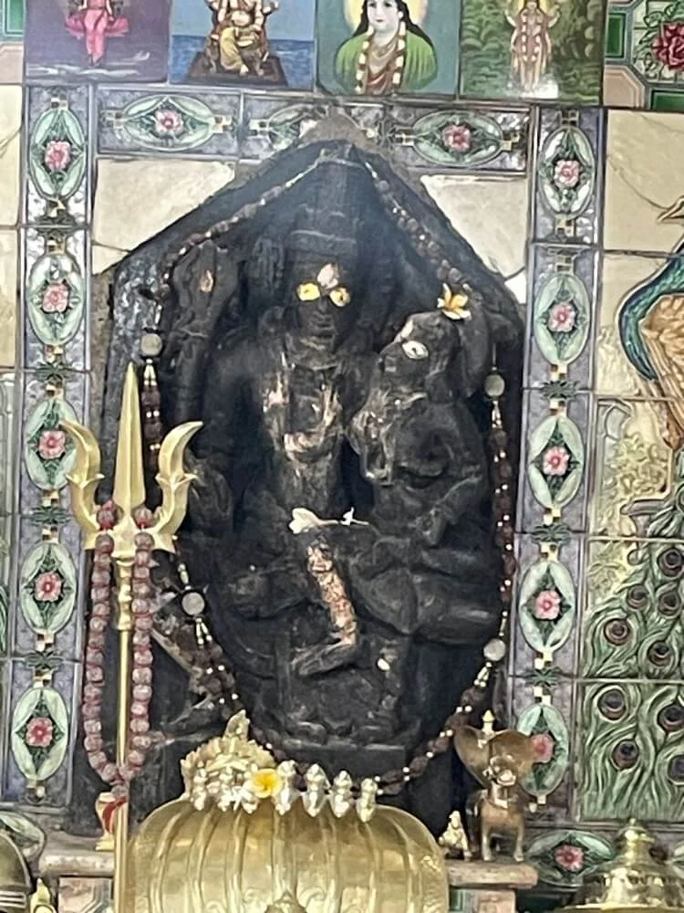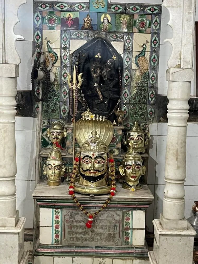 Within the marble-tiled sanctum, visitors find a silver-plated shalunka holding a revered black Shivling, crowned by a Ganesh carving, with a black panel of Shiva-Parvati and five brass masks below. The vestibule also houses fragments of Veergals (hero stones), including rare depictions of women warriors.