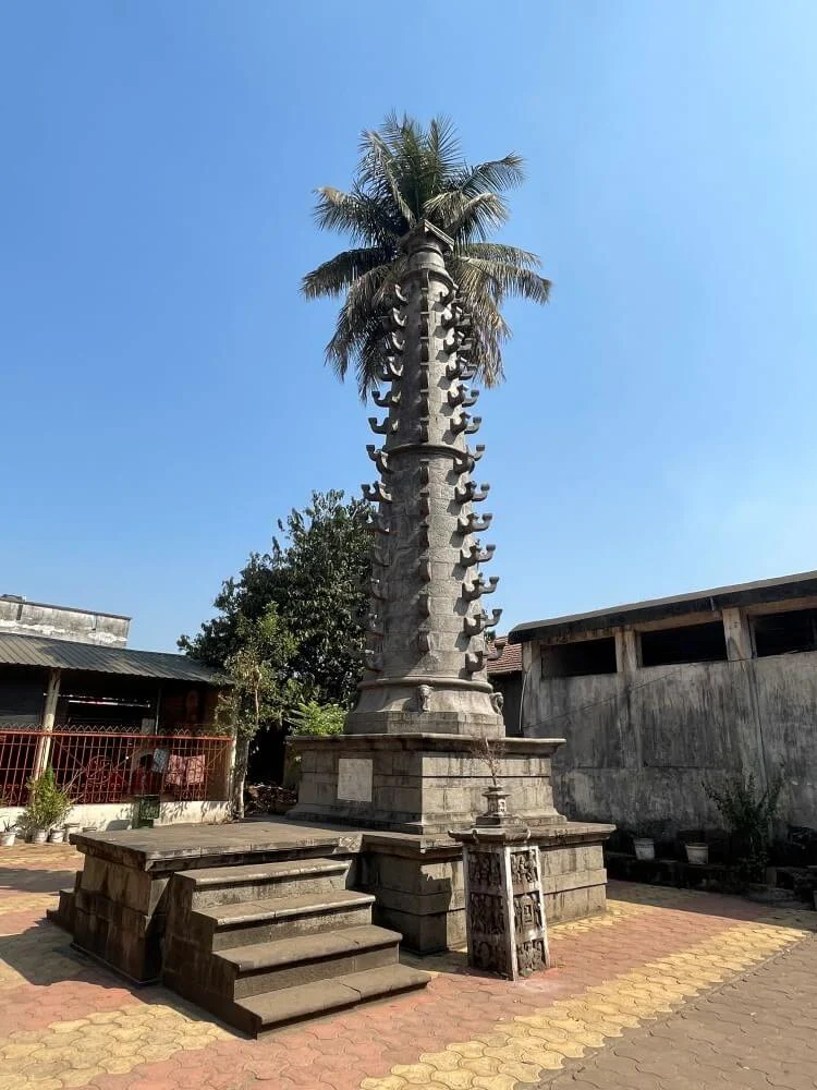 A majestic lamp tower (Deepmala) stands atop a stone platform to the south, thoughtfully placed to preserve uninterrupted views during Kiranotsav. The temple’s architectural highlights include pillars with square bases, octagonal shafts, and circular capitals. Ancient Ganesh idols reside in wall niches, a brass-horned Nandi watches over the sanctum, and a stone tortoise symbolizes Vishnu.