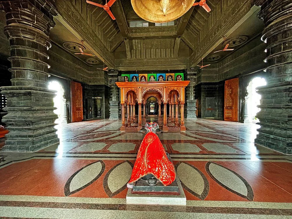 From the main gate, a few stone steps lead up to the elevated temple plinth, where a circular lamp tower (Deepmala) carved with floral motifs stands alongside a sculpted Tulsi Vrindavan. Ascending five steps, devotees reach the Sabhamandap, with a black stone Nandi facing the sanctum. The open hall, supported by twelve wooden pillars joined by arches, allows circumambulation — a practice believed to bring peace and health. Carved corner pillars, a layered ceiling with divine imagery, and latticed stone windows enhance the hall’s aesthetic and ventilation.