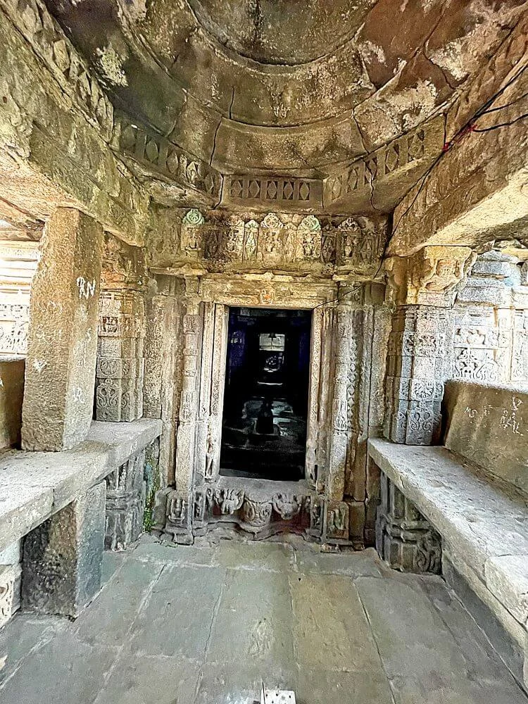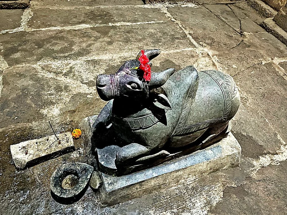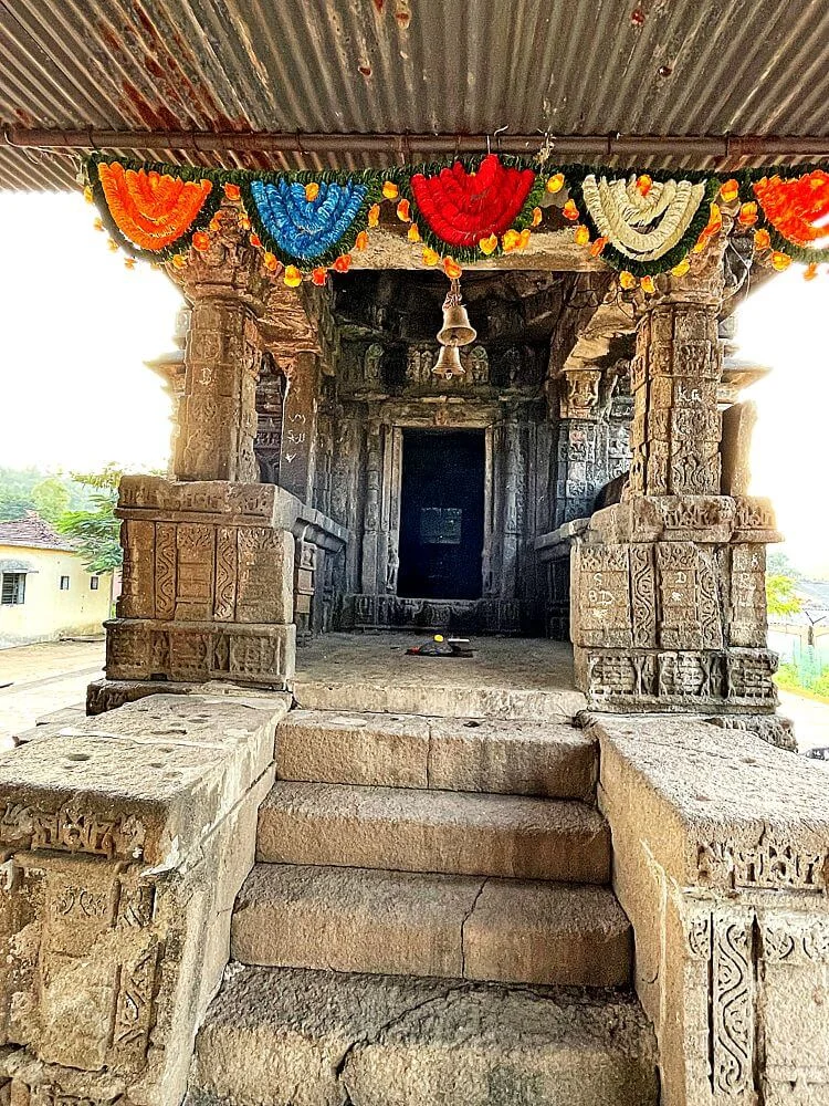 The elevated, east-facing structure features a mukhmandap, sabhamandap, antaral (anteroom), and garbhagriha (sanctum). Visitors ascend four or five steps via a porch adorned with stone railings. The entrance to the sabhamandap is guarded by Shaiva guardian sculptures and a single-piece monolithic Nandi. Intricate craftsmanship is evident in the three dwarashakhas (doorframes), one finely adorned with carved columns, a Ganesh frieze (ganeshpatti), and a central idol of Lord Ganesha. The enclosed sabhamandap boasts pillars with carvings of Kirtimukhas and floral ghatapallava motifs, while a side niche houses yet another graceful Ganesha idol.