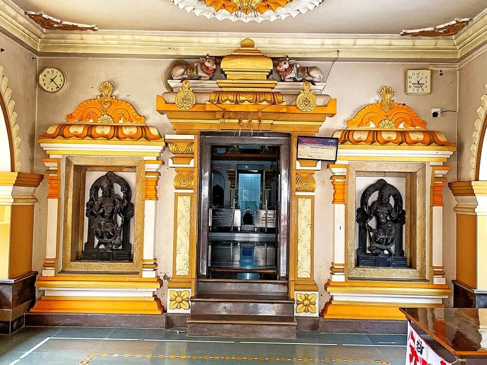 Architecturally, the temple follows Konkani style, resembling an old mansion with courtyards, side shrines, and intricate lamp towers. Visitors enter through a three-story gateway, passing the shrine of Ganesha, into a courtyard adorned with ancient Deepastambhas and carved stone towers depicting elephants, vyalas, birds, and oil lamps. Inside, the Sabhamandap (assembly hall) features wooden pillars linked by arches, leading to the Antaral guarded by colorful statues of Vishnu’s gatekeepers Jaya and Vijaya. Intricate carvings of deities like Krishna, Lakshmi, Garuda, Panchanana Shiva, and Nandi adorn the pillars, reflecting a harmonious spiritual blend.