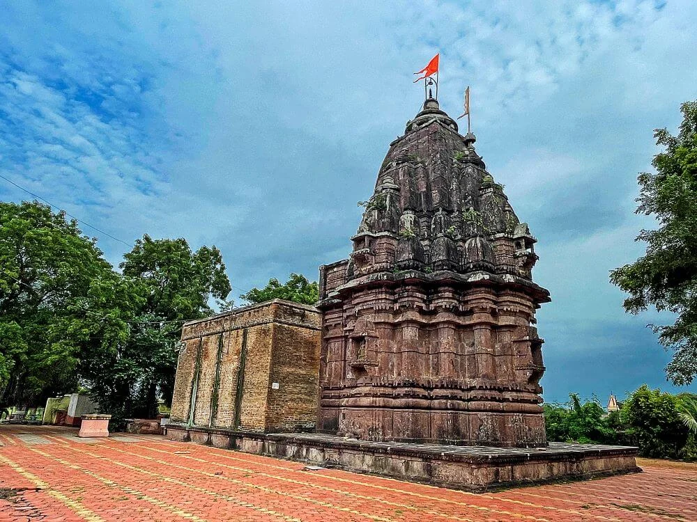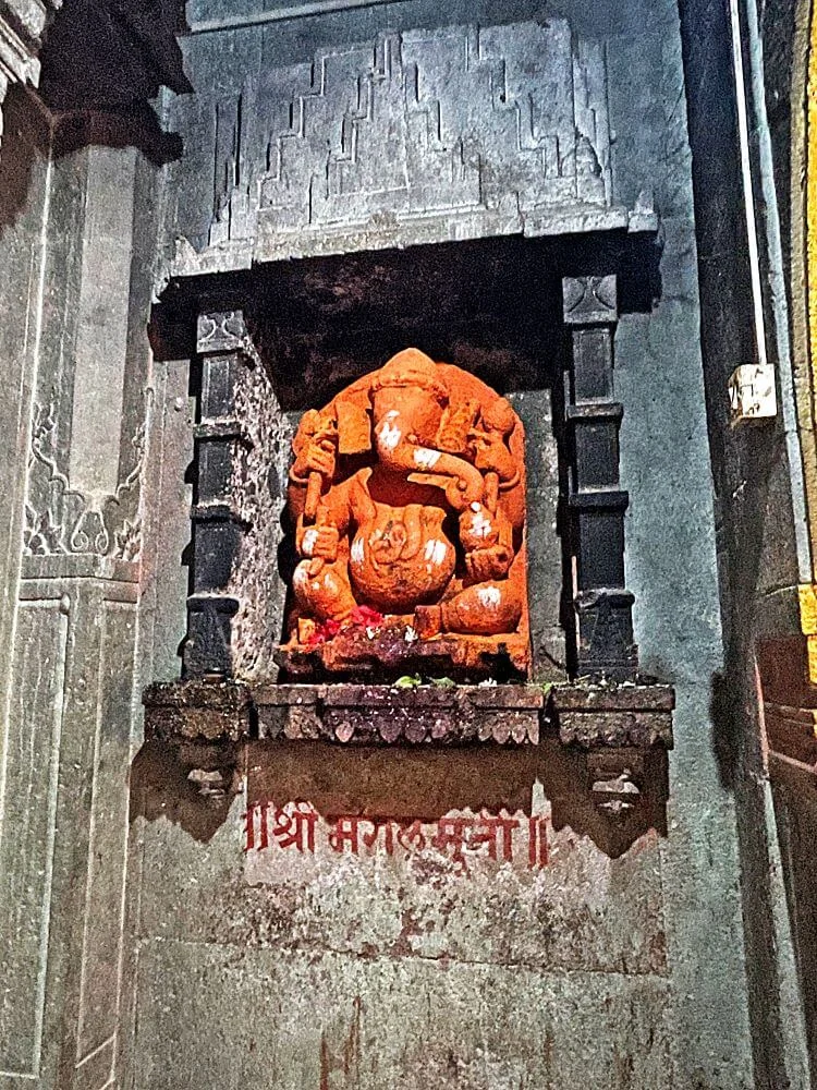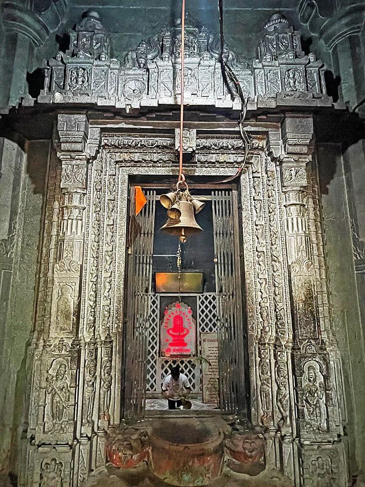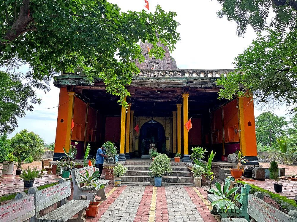 The sanctum’s outer walls are adorned with sculptures of Shiva-Parvati and other deities, while the spire (shikhar) follows the Bhumija architectural style of medieval Maharashtra, featuring tiered miniature spires, a two-layered amalaka, and elephant carvings at the base.