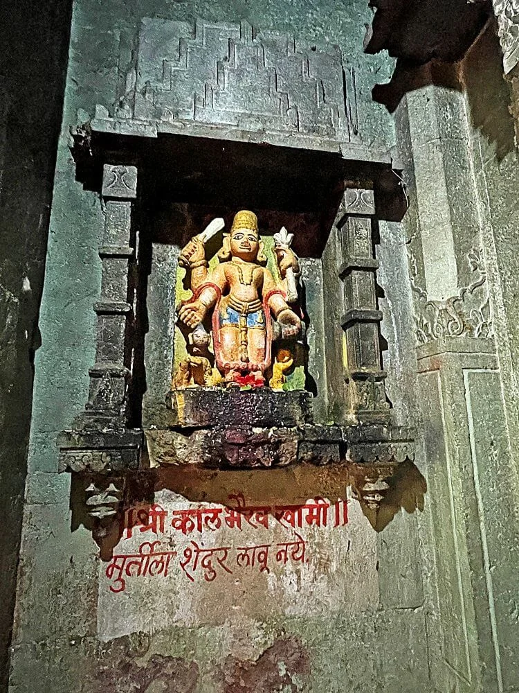 Located half a kilometre outside the village, the temple complex is surrounded by fortified stone walls. At the entrance, a carved stone slab depicts Ravana’s nine heads, reinforcing the temple’s unique identity. The open square-plan assembly hall is supported by two rows of wooden pillars, with a large Nandi statue at the entrance and a tortoise idol at the centre. Side shrines contain colourful figures of Kaal Bhairav and vermillion-smeared Lord Ganesha.