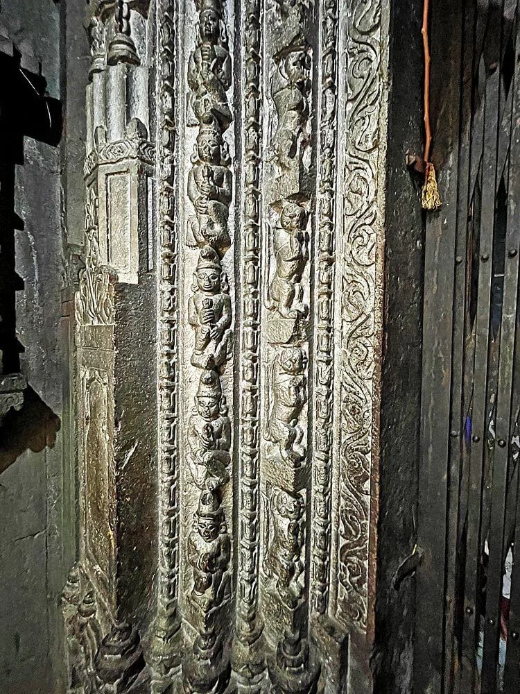 The main sanctum is an architectural gem. Its stone doorway is framed by granite pillars and a trishakha (three-band) design with vyala figures (mythical beasts), celestial deities, and a Ganesha carving on the lintel. Above it, finely chiselled panels depict Shiva, attendants, and Ravana’s nine heads, with a keertimukha guarding the threshold. Visitors enter via an arched, semicircular step into the sanctum, where the brass-clad Shivalinga rests directly on the floor. Its distinctive form — a circular base with triangular extensions — is unique to this shrine.