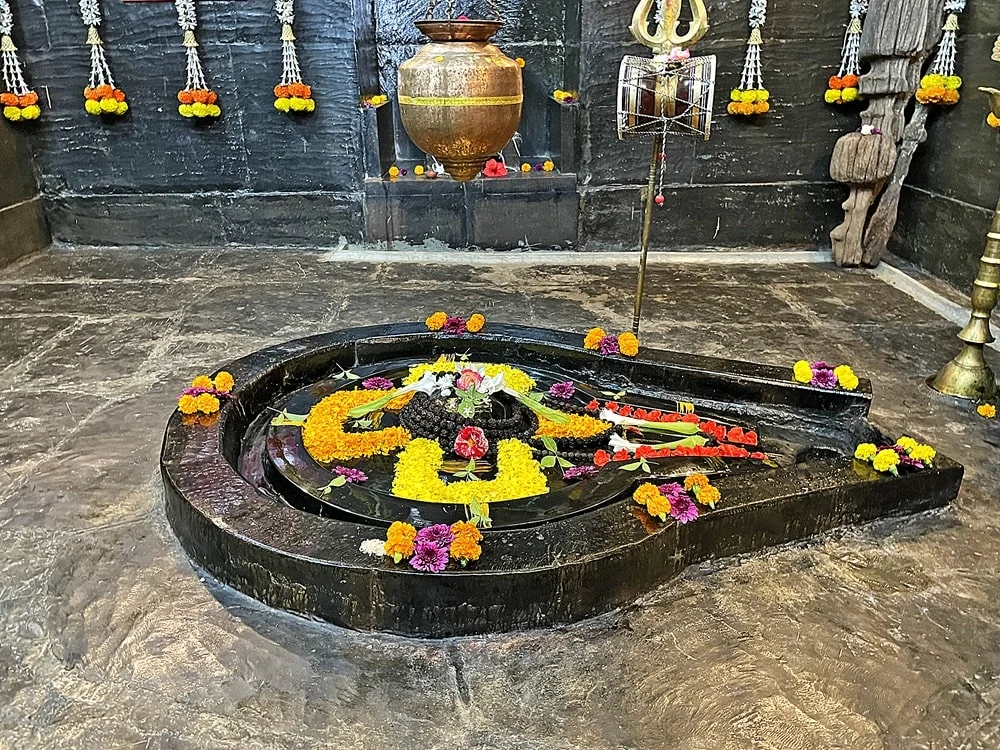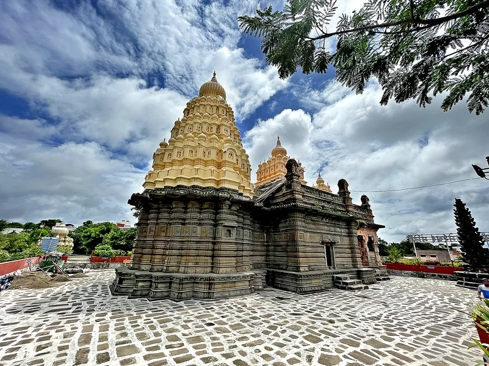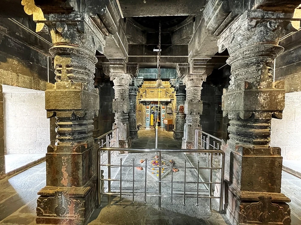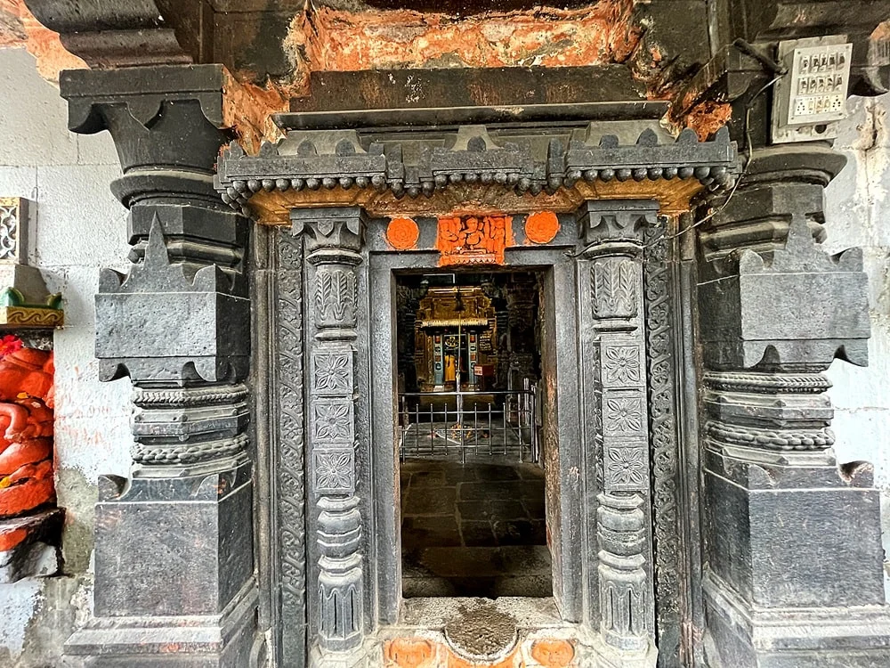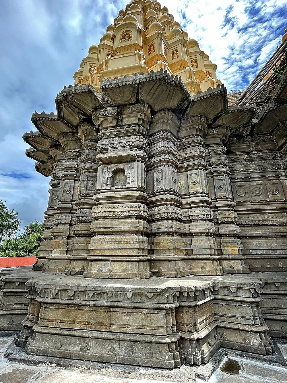 Sabhamandap pillars, lotus motifs, and a turtle carved on the floor symbolize temple stability and prosperity. The east-facing sanctum is entered through a door with intricate leaves and motifs and holds a monolithic black Shiva linga continuously bathed in water. Behind the linga is a Ganesh idol, and the shikhara above the sanctum is adorned with hundreds of layers of mythical and divine figures. Hemadpanthi (black stone, lime, tenon joints) and Maratha styles blend, with ghats leading to the riversides and occasional smaller shrines lining the walkways.