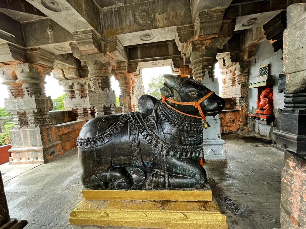The temple is surrounded by gracefully ornamented stone walls, approached via a short walk from Saswad bus stand, and has a large stone courtyard typical of the Yadava period but also showing Peshwa-era renovations. The main shrine includes a Nandimandap housing a striking six-foot black stone Nandi, which dexterously faces north (a rare architectural feature), adorned with carved bells and drapery. Twin stone deepmalas light up the approach and are central to the Tripurari Purnima festival, when countless lamps shine at the rivers’ meeting
