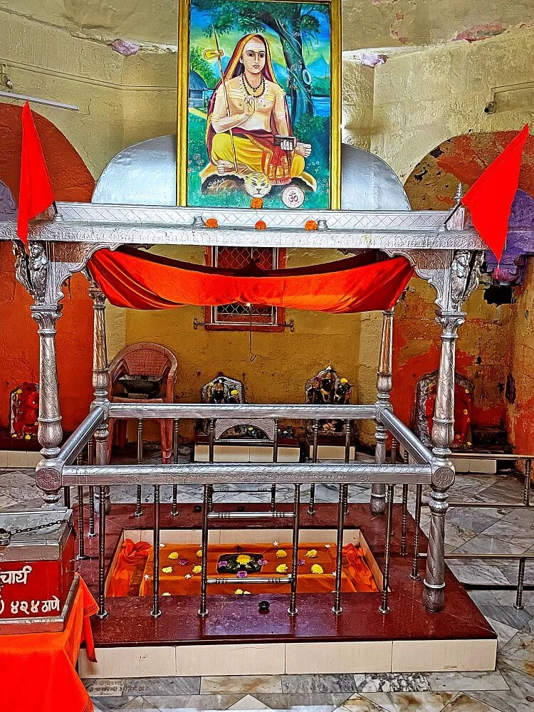 Architecturally, the temple is a magnificent two-storied stone structure resembling a small fort, complete with turrets, arched entrances, cloistered halls, and three shrines dedicated to Shankaracharya, Lord Shiva, and Lord Vishnu. The sanctum sanctorum holds the samadhi of Shankaracharya Swami, while finely sculpted idols of Lord Vishnu, Mahavishnu, and others adorn the adjoining shrines.