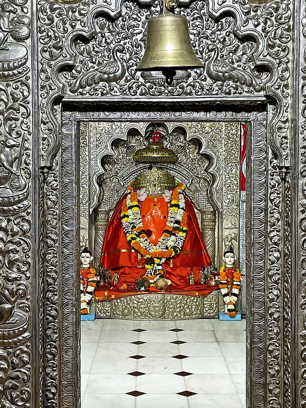 The heart of worship is the self-manifested (swayambhu) Vighnahar Ganapati idol, covered in vermilion, with a left-curved trunk, ruby eyes, and a diamond on the forehead—a rare and auspicious form. Flanked by Riddhi and Siddhi brass idols, Ganesha is venerated as the Lord Remover of Obstacles, and the legend of King Abhinandan’s disrupted yajna stresses the temple’s importance as a place for overcoming life’s troubles. Since entry to the inner sanctum is restricted, a replica idol outside welcomes devotees’ offerings and prayers
