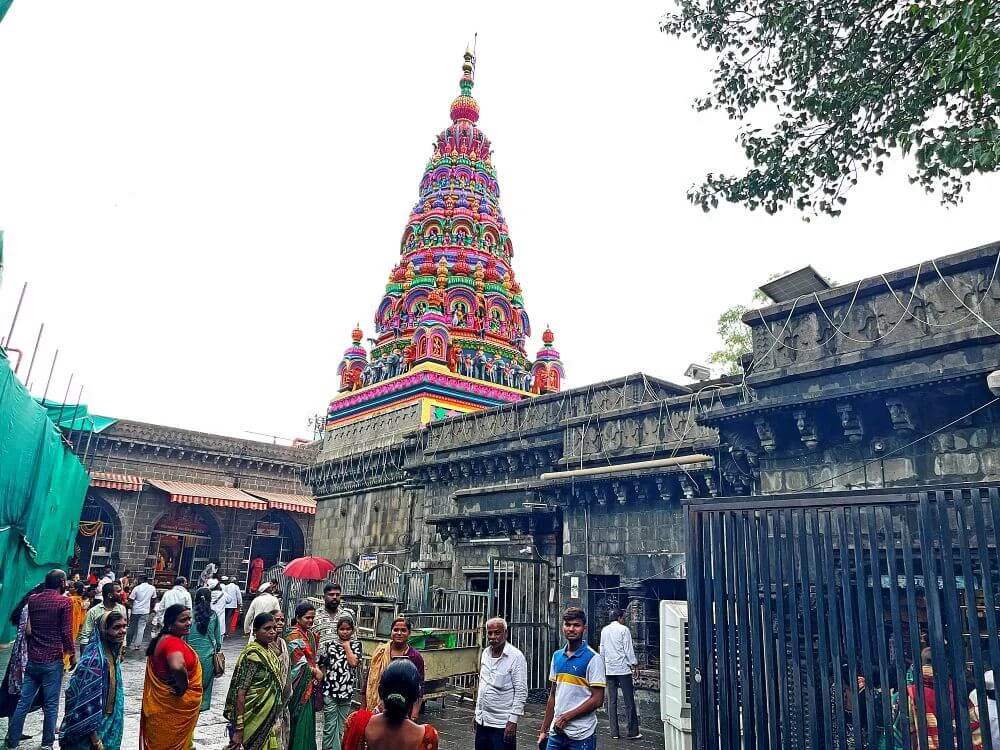 The temple complex is an architectural delight, entered through two majestic gateways named after Shahaji Maharaj and Rajmata Jijabai. Within the temple enclosure lies the sacred Gomukh Tirth, believed to be connected to the Ganga, and Kallol Tirth, surrounded by legends of divine rivers converging here. The main sanctum houses a remarkable eight-armed idol of Goddess Tulja Bhavani, carved from Gandaki stone, depicted in a dynamic stance over the demon Mahishasur, exuding an aura of strength and compassion. The temple’s golden spire, donated by a devotee from Beed, gleams as an emblem of faith and devotion.