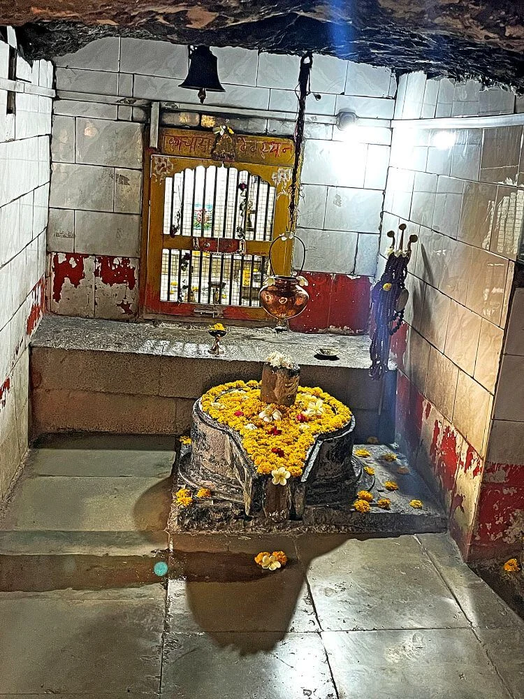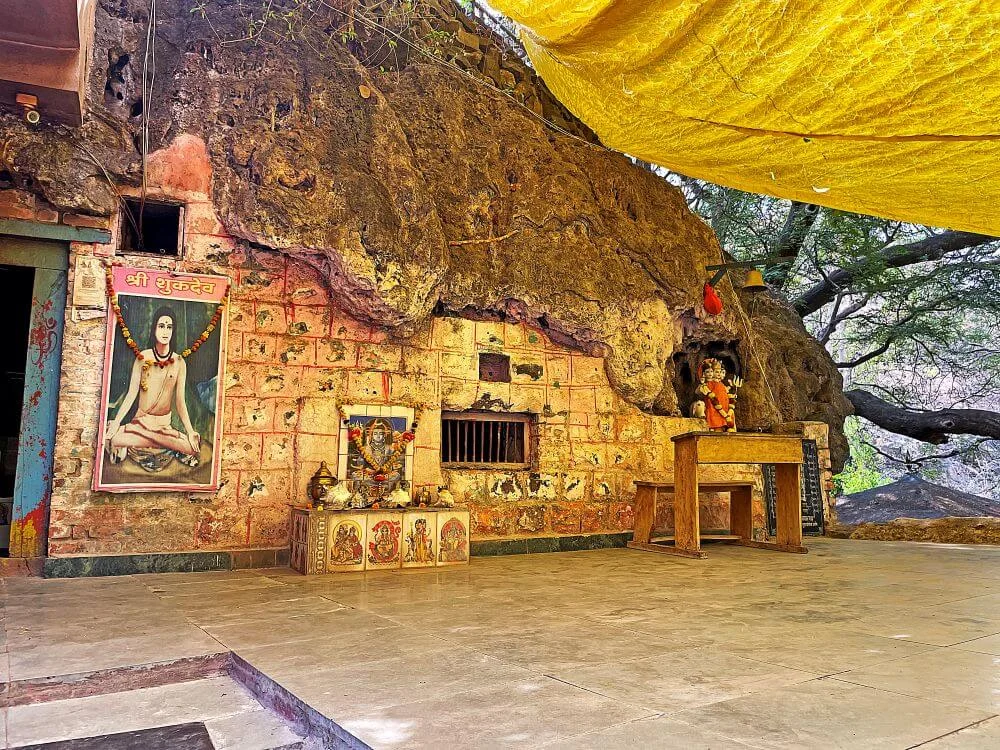 The temple’s vestibule leads to a sanctum revered as Shukacharya’s back (Shukadev Pashchat) — a stone wall where devotees gently touch and pray for wish fulfillment. Inside resides a brass mask of Sage Shukacharya, installed for darshan. Nearby caves preserve remnants of an ancient fire altar (Yajna Kund) and a meditative stone idol of the sage, seated in deep penance.