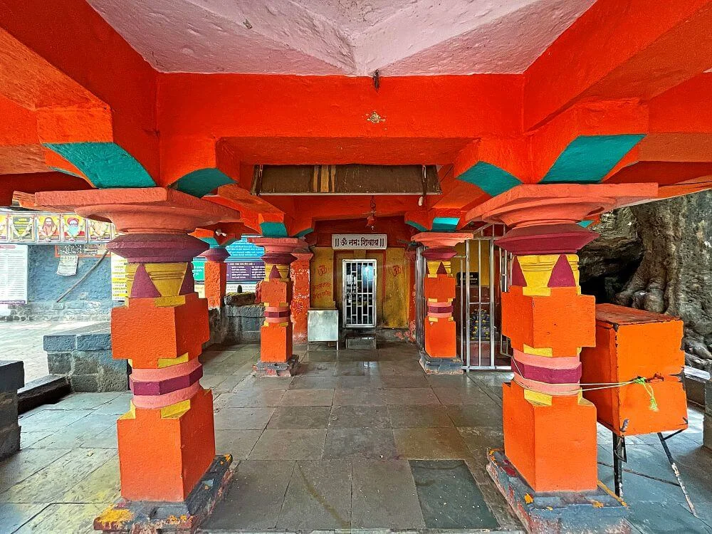 The temple courtyard greets visitors with sacred elements — a Tulsi Vrindavan, serpent idols, Nandi statues, and ancient samadhis. The cave shrine dedicated to Shiva houses a peaceful Lingam, while the elevated Sabhamandap (assembly hall) features a series of intricately carved stone pillars in geometrical shapes — square, hexagonal, octagonal, and triangular. These pillars, with decorative corbels and connecting beams, showcase medieval stone craftsmanship at its finest. Within the hall lie the samadhi of Shri Shivgiri Maharaj, alongside stone idols of Ganapati and Bhairav, symbolizing divine guardianship.
