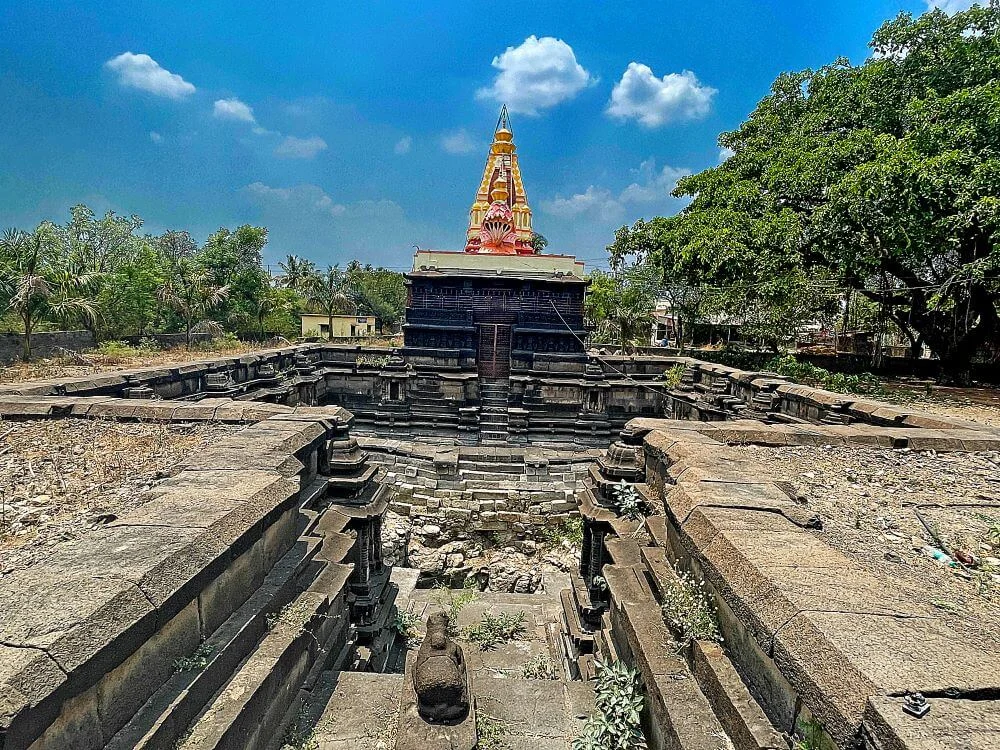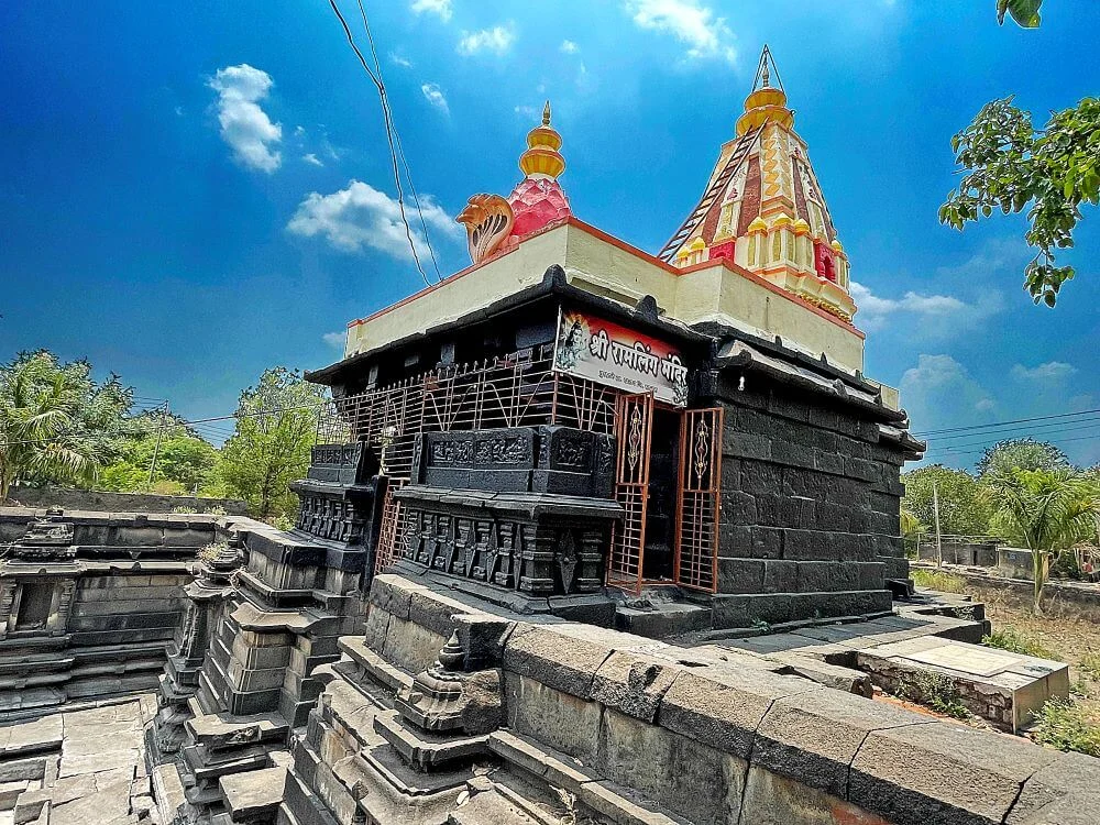 At the heart of it lies the Someshwar Temple, built in distinctive Hemadpanti style, situated atop a one-meter-high stone platform. The structure has seen several restorations, reflecting a fusion of the ancient and the later. Statues of Sant Tukaram Maharaj and Samarth Ramdas Swami welcome visitors at the entrance. Within, a brass-clad stone Nandi leads to two assembly halls—the inner of which is semicircular and carved from solid stone. The sanctum’s ornately decorated door frame opens to a main Shivalinga, nearly a meter tall, with a brass Mahadev idol standing behind. Below the central sabhamandap lies the Guptling, a secret linga visible only through a narrow aperture and venerated daily along with the main idol. Thus, the Someshwar Temple alone houses two of the village’s five Jyotirlingas.