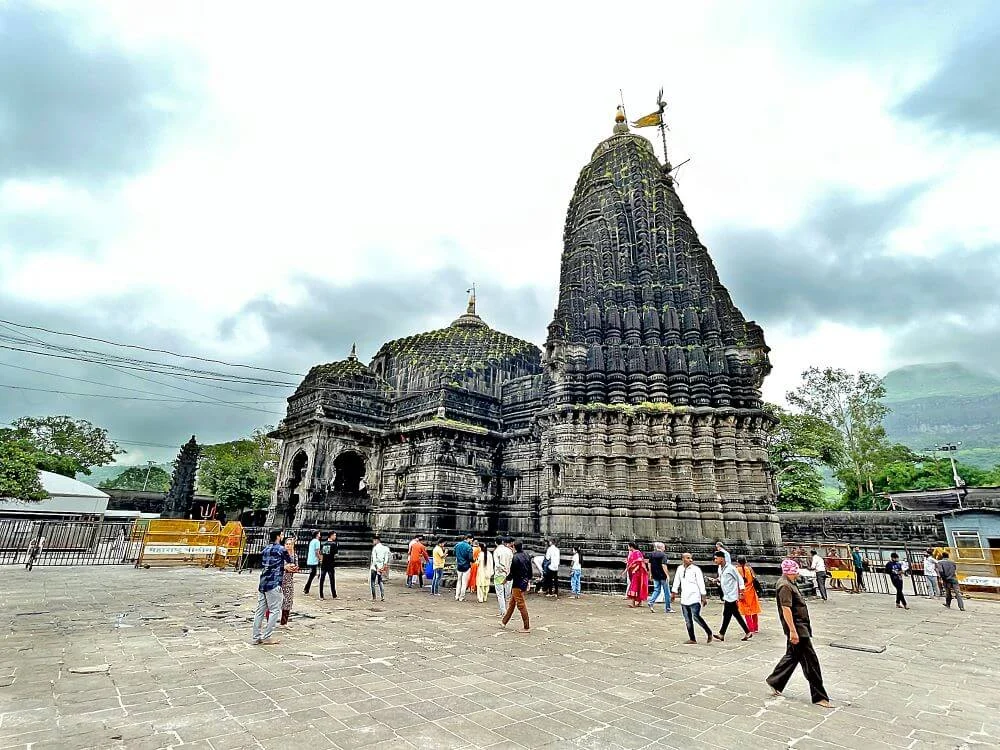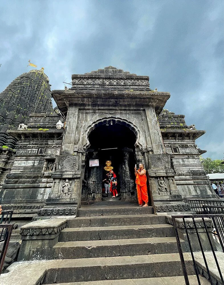 The temple, built from black basalt stone in the Hemadpanti style, combines architectural grace with spiritual power. The magnificent golden spire (kalash), trident, and five‑metal flag glisten above the tower. Its walls are carved with deities, celestial beings, and intricate motifs symbolizing divine energy. Originally constructed in the 10th century by King Jhanj of the Shilahara dynasty, it was later restored by Nana Saheb Peshwa in the 18th century. The reconstruction took 31 years and involved over 700 artisans. The detailed stonework, marble from Makrana in Rajasthan, and golden embellishments testify to centuries of devotional craftsmanship.
