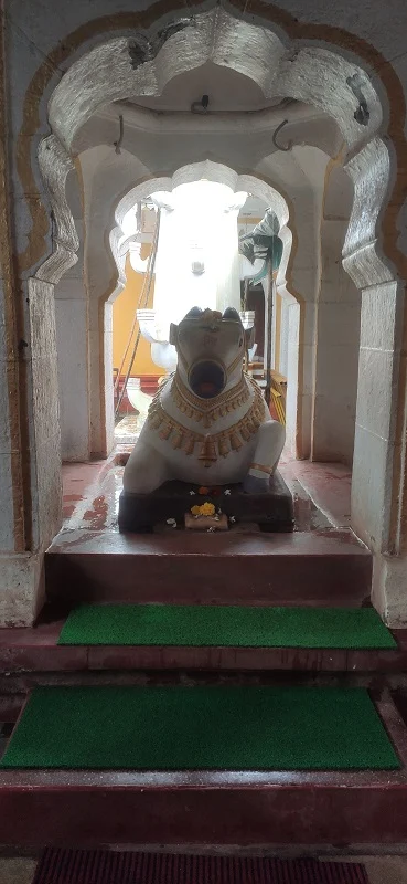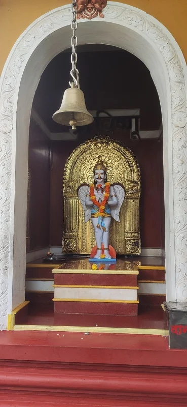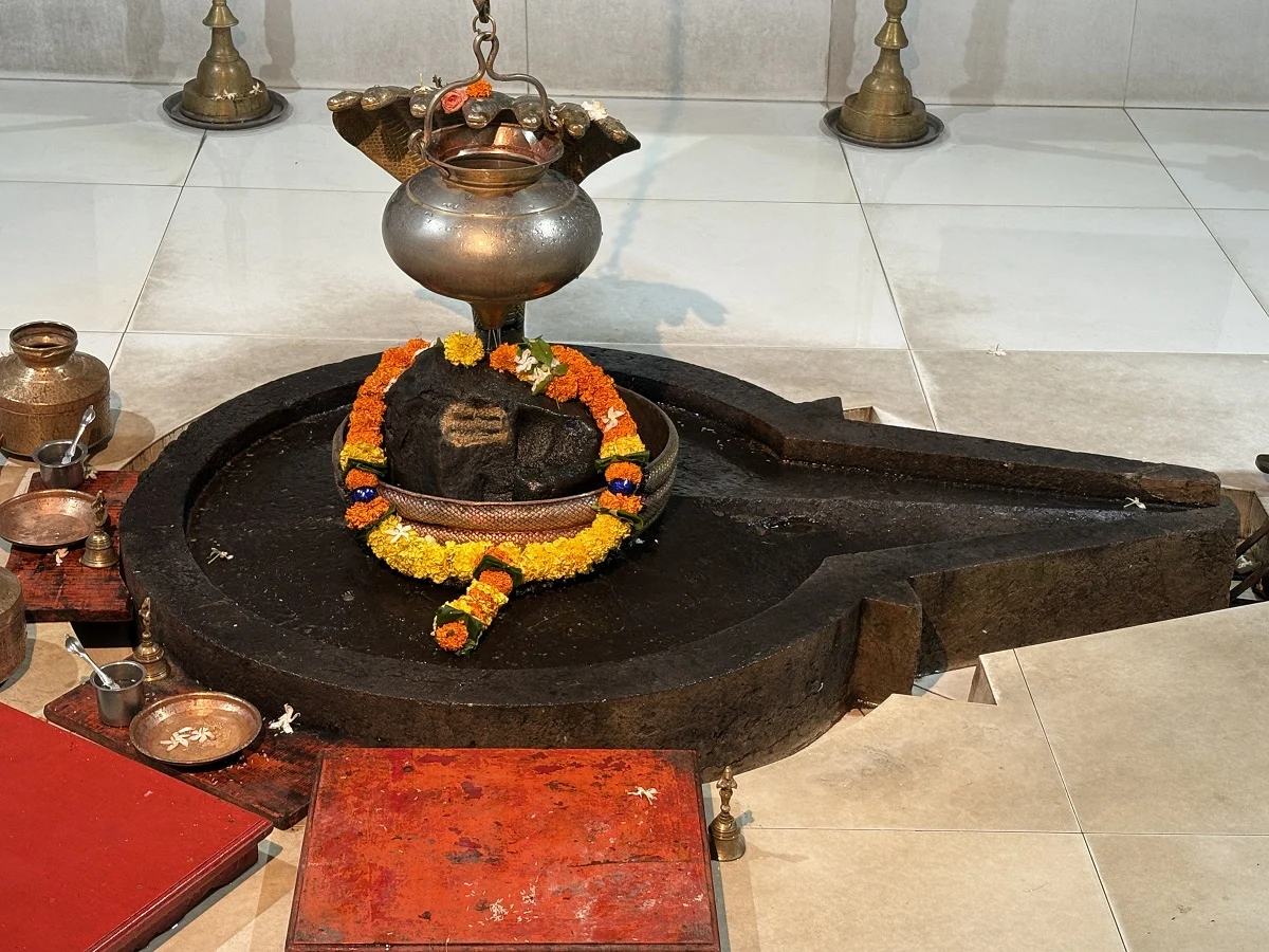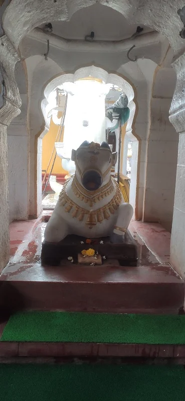 The temple, approximately 350 years old in its current form, features a majestic east-facing entrance with intricate stone carvings of lions, dancers, and serpents. Inside, one can find stunning idols of Hanuman and Garuda, along with subsidiary shrines of Surya, Ganpati, Ambika, and Vishnu, making the temple a Shiva Panchayatan complex. The sanctum houses the ancient self-manifested Shivling encircled by a brass serpent with seven hoods, still showing symbolic marks from the ancient tale. A stone Nandi sits in the front mandap, while the presence of a rare triangular well within the premises adds architectural uniqueness.