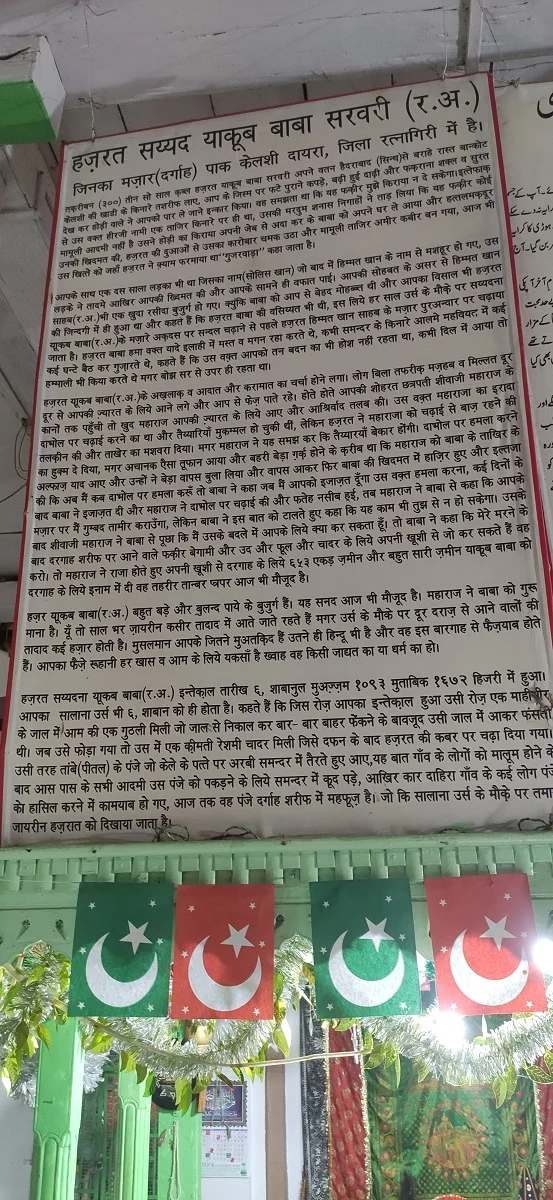 The shrine also has a connection to the era of Chhatrapati Shivaji Maharaj. It is believed that during his campaign in Dabhol around 1666, Shivaji Maharaj met Yakutbaba, sought his guidance, and granted 653 acres of land around the Dargah. While some accounts even call Yakutbaba the spiritual guru of Shivaji Maharaj — a claim not supported by historical records — the mention of Yakutbaba appears in the 98 Kalami Bakhar, adding to the intrigue of his legacy.